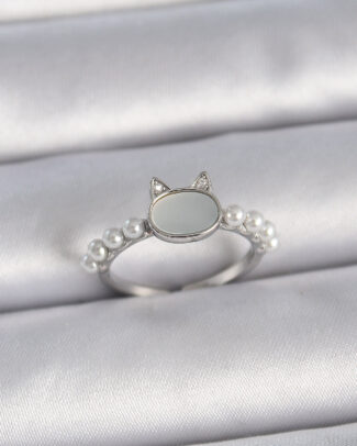 Pirinç Gümüş Renk Ayarlanabilir Beyaz Mineli Kedi Model İnci Detay Kadın Yüzük