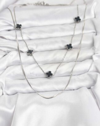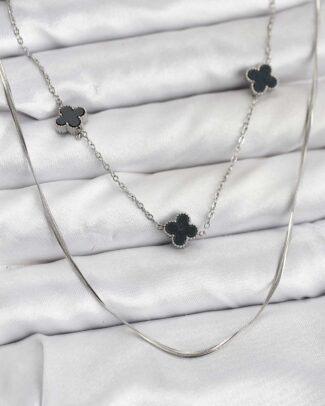 316L Çelik Zincir Gümüş Renk İtalyan Zincirli Siyah Yonca Model Kadın Kolye