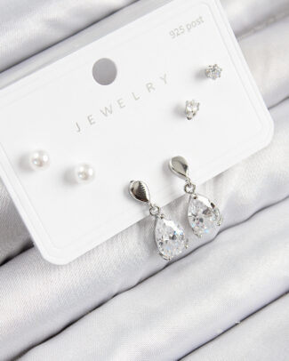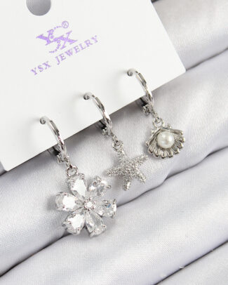 Pirinç Zirkon Taşlı 3’lü Çiçek Ve İstiridye Model Gümüş Renk Kadın Küpe