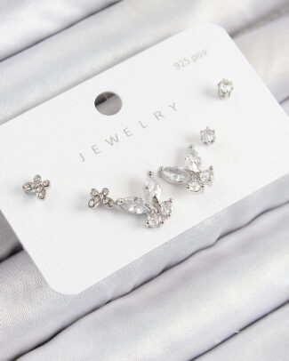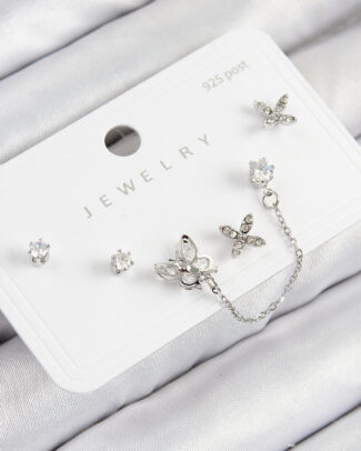 Pirinç Zirkon Taşlı Kelebek Model Gümüş Renk 925 Ayar Gümüş Çivi Kadın Küpe Set