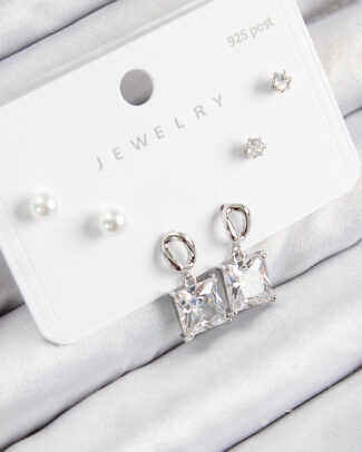 Pirinç Zirkon Taşlı Sallantılı Kare Model Gümüş Renk 925 Ayar Gümüş Çivi Kadın Küpe Set