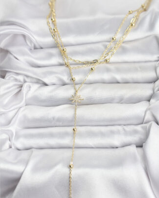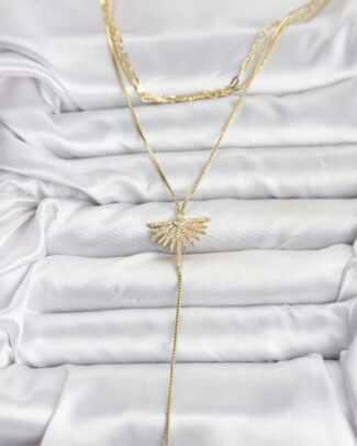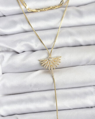 Pirinç Gold Renk Zirkon Taşlı Yelpaze Model Detaylı 3’lü Kombin Y Kadın Kolye