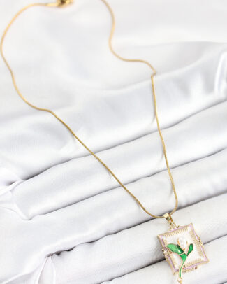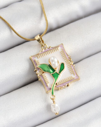 316L Çelik Zincir Beyaz Sanatsal Portre Sallantılı İnci Detaylı Lale Model Gold Renk Kadın Kolye