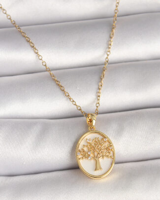 316L Çelik Gold Renk Zincir Zirkon Taş Detaylı Beyaz Mineli Ağaç İşlemeli Portre Model Kadın Kolye