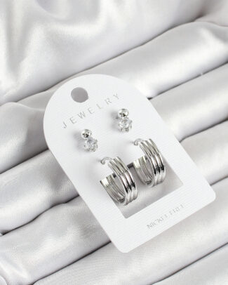Pirinç Zirkon Taş Ve Halka Figürlü Gümüş Renk 3’lü Çift Kadın Küpe Set