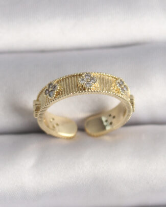 Pirinç Gold Renk Zirkon Taşlı Yonca İşlemeli Ayarlanabilir Yüzük