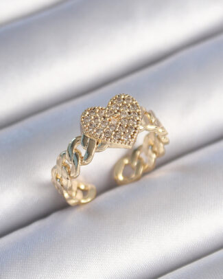 Pirinç Gold Renk Zincir Kordon Zirkon Taşlı Kalp Model Kadın Yüzük