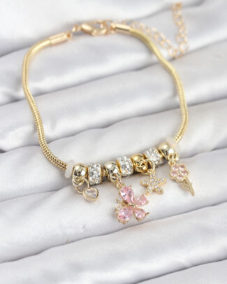 Pirinç Gold Renk Pembe Kelebek Charmlı Kadın Bileklik