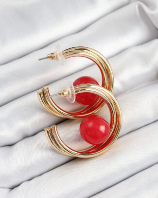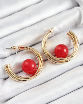 Pirinç Gold Renk Halka Model Kırmızı Boncuk Detay Kadın Küpe