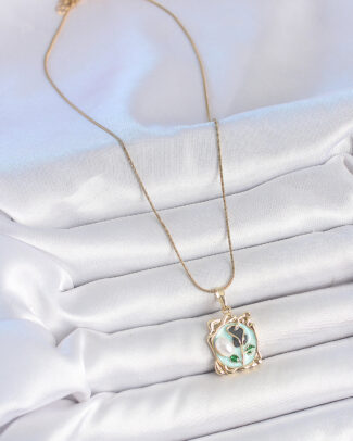 316L Çelik Gold Renk Zincir Mavi Mineli Çiçek İşlemeli İnci Detay Portre Model Kadın Kolye