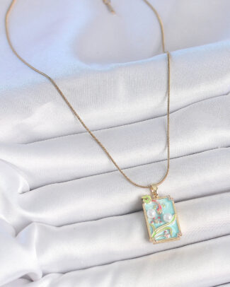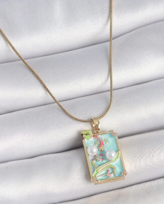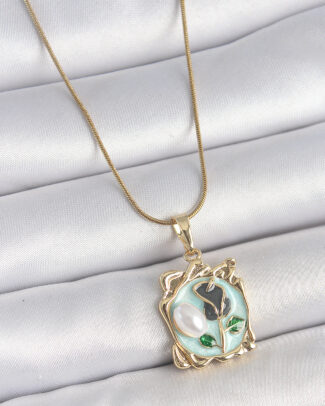 316L Çelik Gold Renk Zincir Mavi Mineli İncili Çiçek İşlemeli Portre Model Kadın Kolye