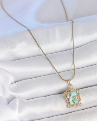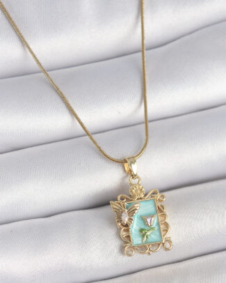 316L Çelik Gold Renk Zincir Mavi Mineli Çiçek İşlemeli Zirkon Taşlı Kelebek Detay Portre Model Kadın Kolye