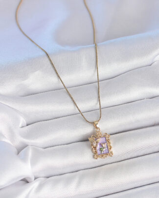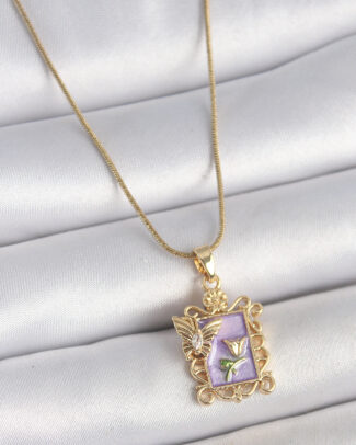 316L Çelik Gold Renk Zincir Mor Mineli Çiçek İşlemeli Zirkon Taşlı Kelebek Detay Portre Model Kadın Kolye