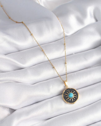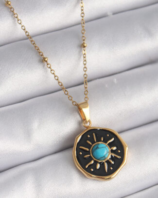316L Çelik Gold Renk Mavi Boncuk Güneş İşleme Madalyon Model Kadın Kolye