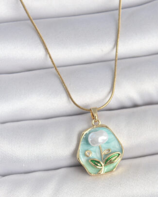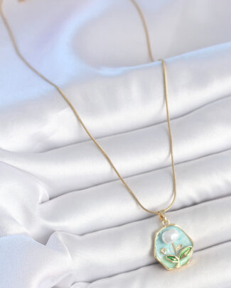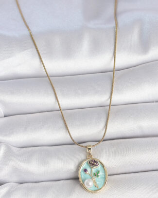 316L Çelik Gold Renk Zincir Mavi Çiçek İşlemeli İnci Detay Portre Model Kadın Kolye