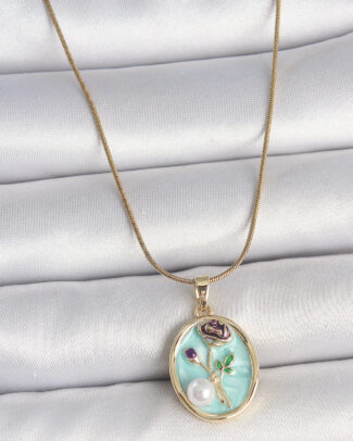316L Çelik Gold Renk Zincir Mavi Çiçek İşlemeli İnci İşlemeli Portre Model Kadın Kolye