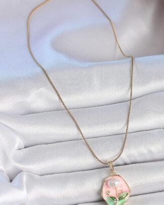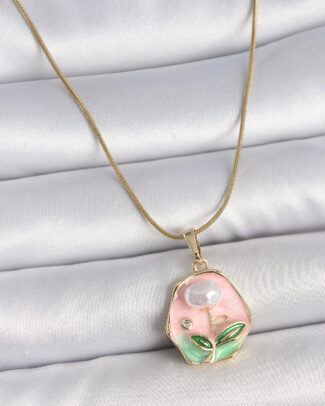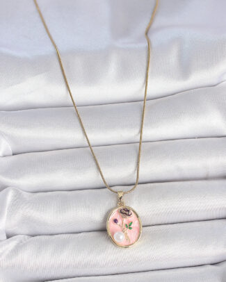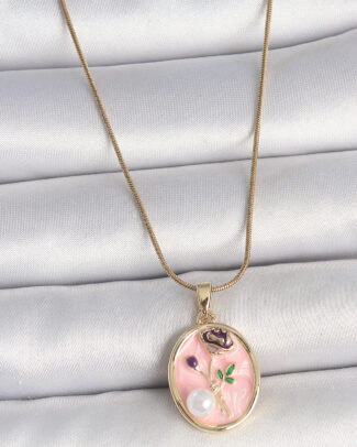 316L Çelik Gold Renk Zincir Pembe Çiçek İşlemeli İnci Detay Portre Model Kadın Kolye