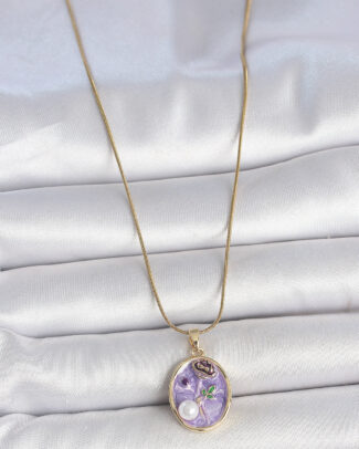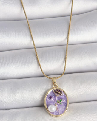 316L Çelik Gold Renk Zincir Mor Çiçek İşlemeli İnci Detay Portre Model Kadın Kolye