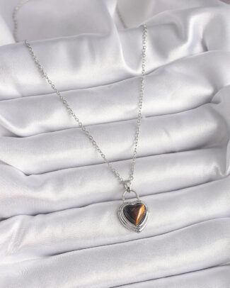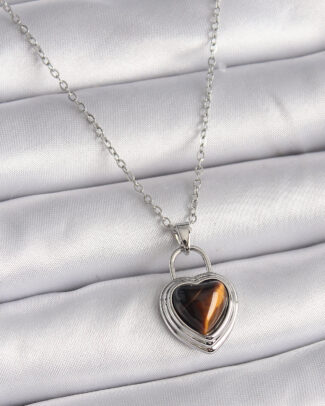 316L Çelik Gümüş Renk Zincir Kilit Kalp Kehribar Boncuk Model Kadın Kolye