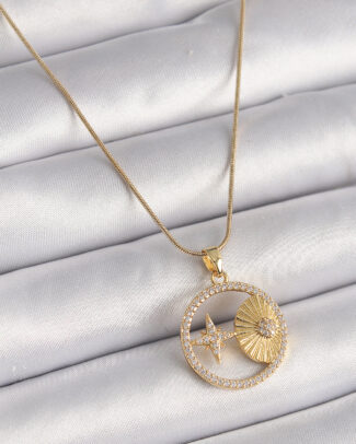 316L Çelik Gold Renk Zincir Zirkon Taşlı Yıldız İşleme Madalyon Model Kadın Kolye