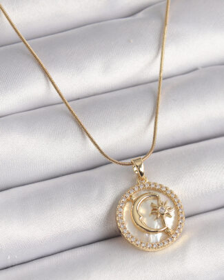 316L Çelik Gold Renk Zincir Zirkon Taş Detaylı Beyaz Sedefli Ay Yıldız Model Kadın Kolye
