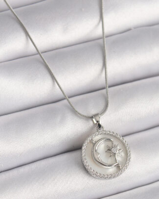 316L Çelik Gümüş Renk Zincir Zirkon Taş Detaylı Beyaz Sedefli Ay Yıldız İşleme Kadın Kolye