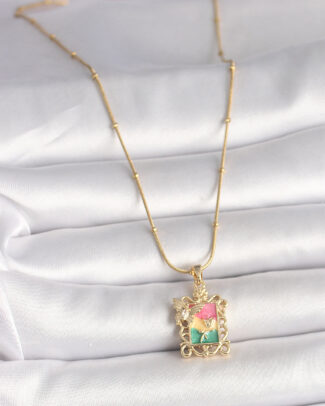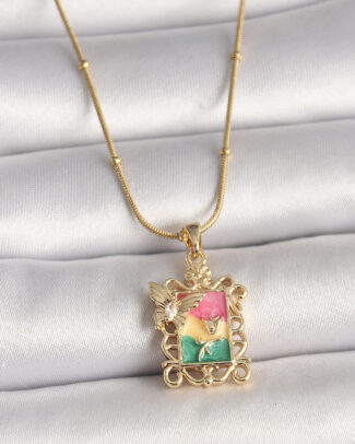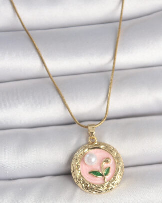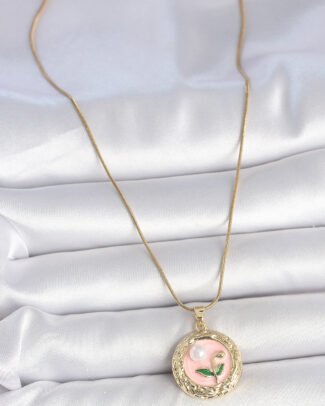 316L Çelik Gold Renk Zincir Pembe Çiçek İşlemeli inci Detay Portre Model Kadın Kolye