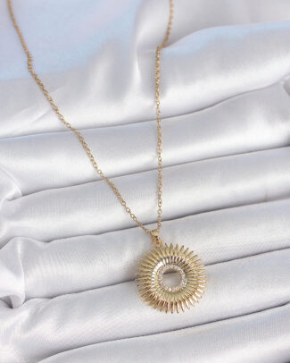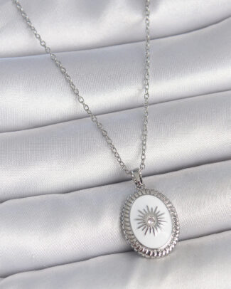 316L Çelik Gümüş Renk Beyaz Mineli Güneş İşlemeli Nazar Boncuk Detay Madalyon Model Kadın Kolye