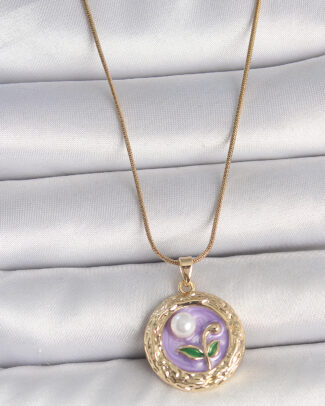 316L Çelik Gold Renk Zincir Mor Çiçek İşlemeli İnci Detay Potre Model Kadın Kolye