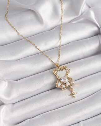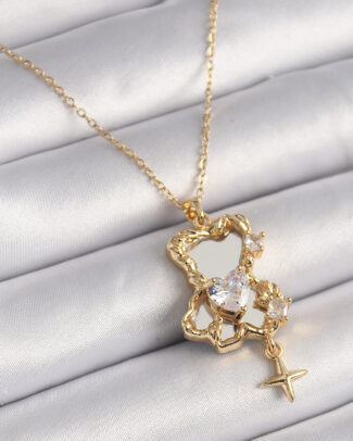 316L Çelik Gold Renk Zincir Ayna Ayıcık Model Zirkon Taşlı Kalp Model Kadın Kolye