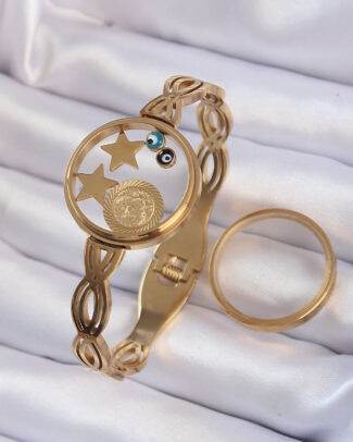 316L Çelik Altın Renk İçi Nazar Boncuk ve Yıldız Figürlü Açılabilir Fanus Kelepçe