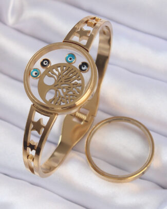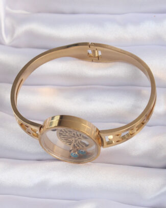 316L Çelik Altın Renk İçi Yaşam Ağacı ve Nazar Boncuk Figürlü Açılabilir Fanus Kelepçe