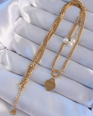 316L Çelik Gold Renk Çift Zincir İnci Detayı Love Kalp Kolye