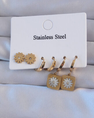 316L Çelik Gold Renk Zirkon Taşlı Sedefli Papatya Model Halka Küpe Seti
