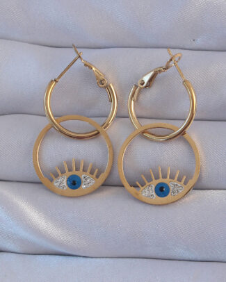 316L Çelik Gold Renk Zirkon Taşlı Mavi Göz Tasarımlı Halka Küpe
