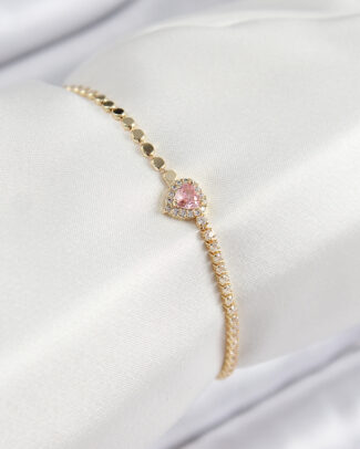 Pirinç Zirkon Taşlı Kalp Model Ezme Zincir Gold Renk Kadın Bileklik