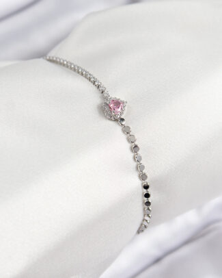 Pirinç Zirkon Taşlı Kalp Model Ezme Zincir Gümüş Renk Kadın Bileklik