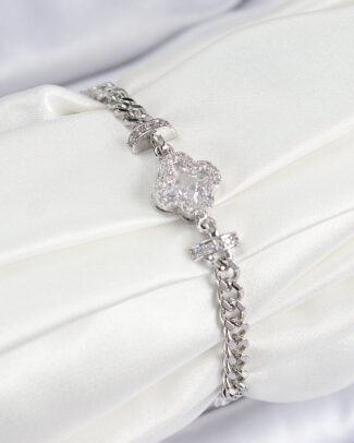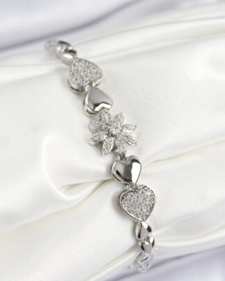 Pirinç Zirkon Taşlı Kalp Detaylı Çiçek Model Gümüş Renk Kadın Bileklik