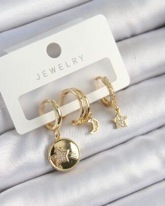 Pirinç Zirkon Taşlı Yıldız Ve Ay Model Gold Renk 3’lü Çift Kadın Küpe Set