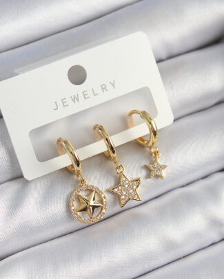 Pirinç Zirkon Taşlı Yıldız Model Gold Renk 3’lü Çift Kadın Küpe Set