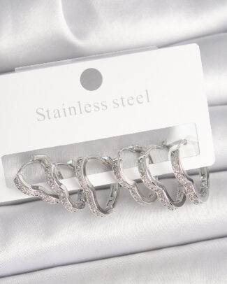 Pirinç Gümüş Renk Zirkon Taşlı 3 Çift Kalp Model Kadın Küpe