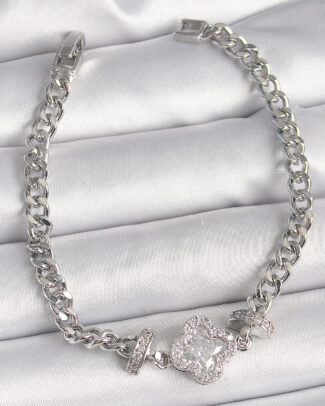 Pirinç Gümüş Renk Zirkon Taşlı Yonca Model Zincir Model Kadın Bileklik