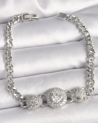 Pirinç Gümüş Renk Zirkon Taşlı Leopar Figür Zincir Model Kadın Bileklik