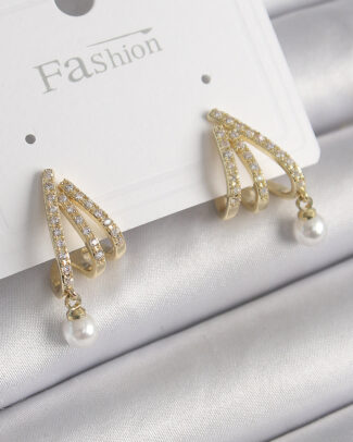 Pirinç Gold Renk Zirkon Taşlı Pençe Model İnci Detay Kadın Küpe