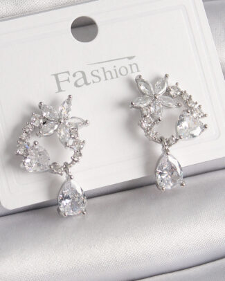 Pirinç Gümüş Renk Zirkon Taşlı Çiçek Model Sallantı Damla Detay Kadın Küpe