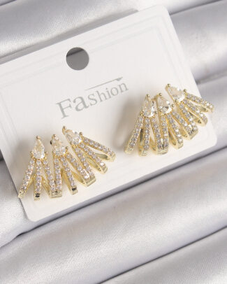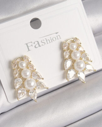 Pirinç Gold Renk Zirkon Taşlı Yaprak Model İnci Detay Kadın Küpe