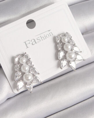 Pirinç Gümüş Renk Zirkon Taşlı Yaprak Model İnci Detay Kadın Küpe