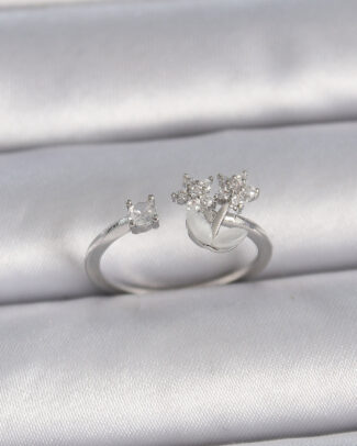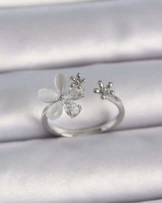 Pirinç Gümüş Renk Ayarlanabilir Zirkon Taşlı Beyaz Mineli Yaprak Model Kadın Yüzük