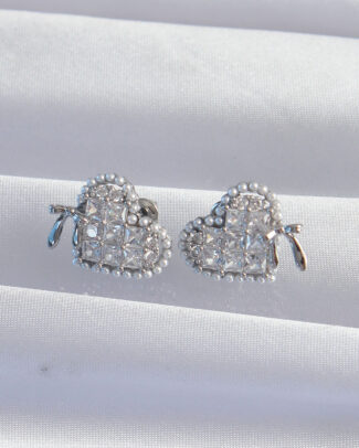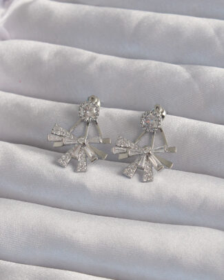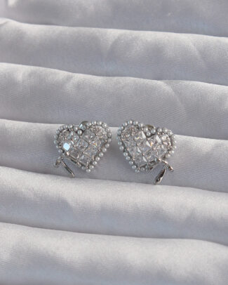 Pirinç Gümüş Renk Fiyonk Detay İncili Zirkon Taşlı Kalp Küpe