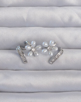 Pirinç Gümüş Renk Zirkon Taşlı Kıvrımlı İnci Çiçek Küpe